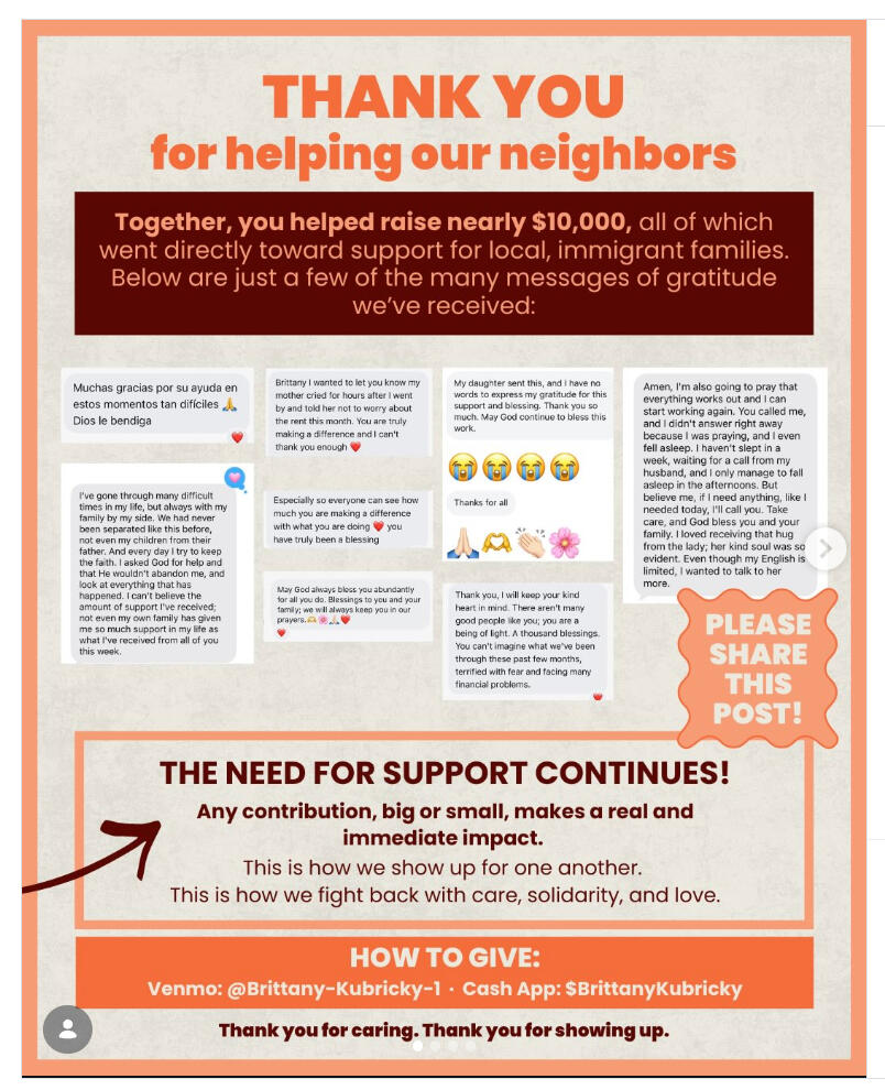 Lists are LONG. Need is IMMEDIATE. The amount of eviction notices I’ve seen is staggering. This didn’t just start with Renee Good, folks have been targeted and scared for months.I have contacts from Immigrant Law Center, social workers, community members reaching out who are at a loss of how to help their clients. The most common response I get from those asking for help is “thank you so much for responding to me.” I KNOW we are all working hard. I KNOW the amount of need is staggering. Please know that what you’re doing to support this fund is going swiftly to those in need, as a bridge to the next hurdle. I will keep going as long as your support keeps pouring in.I love you. My spirit is bolstered by the insane outpouring of love for my community. Together we can. Graphic credit to the ever amazing @madison.petrylikethedish ❤️❤️#mnstrong #iceoutmn #stpaulstrong #community.Note below - Original Instagram post from Jan 15.