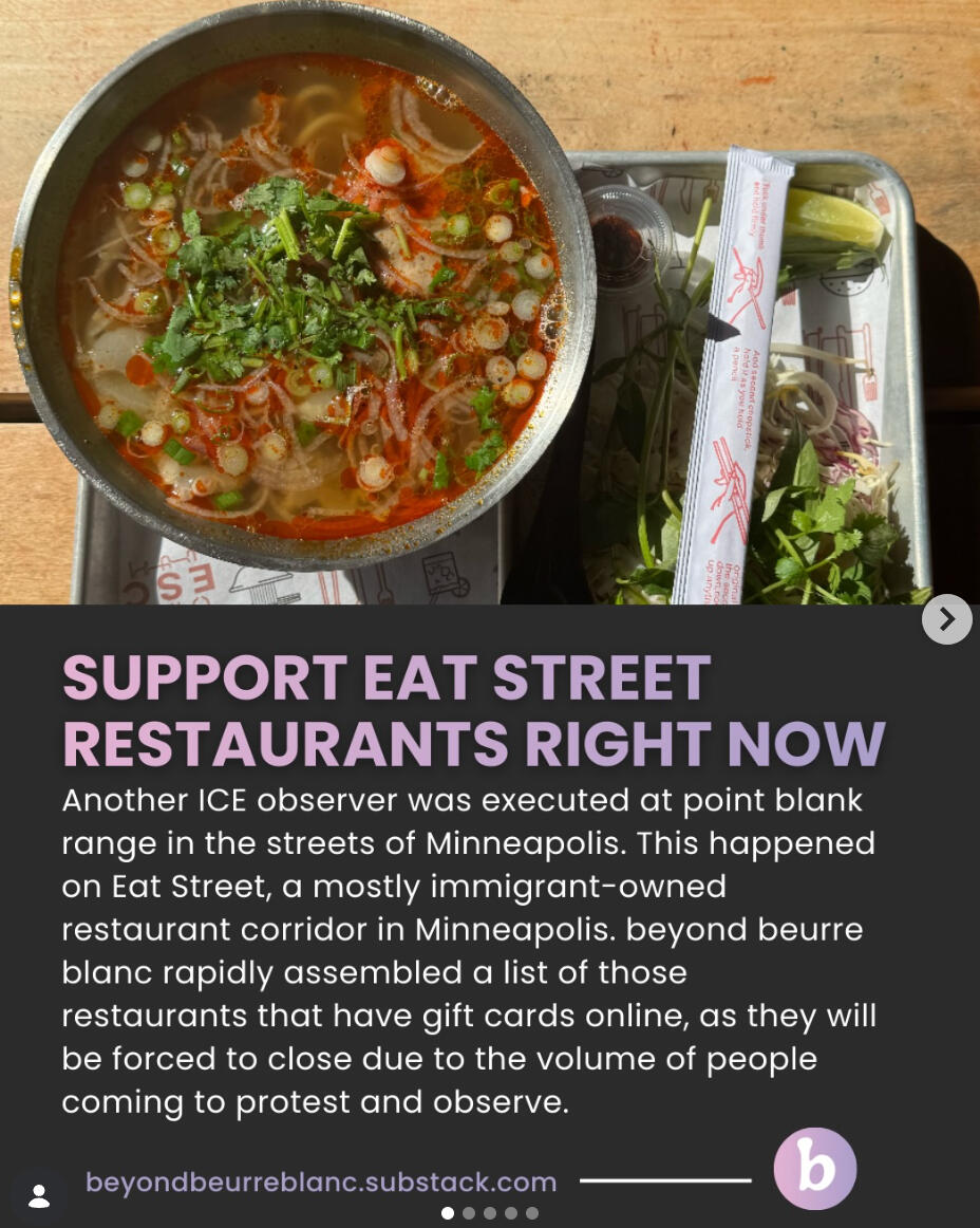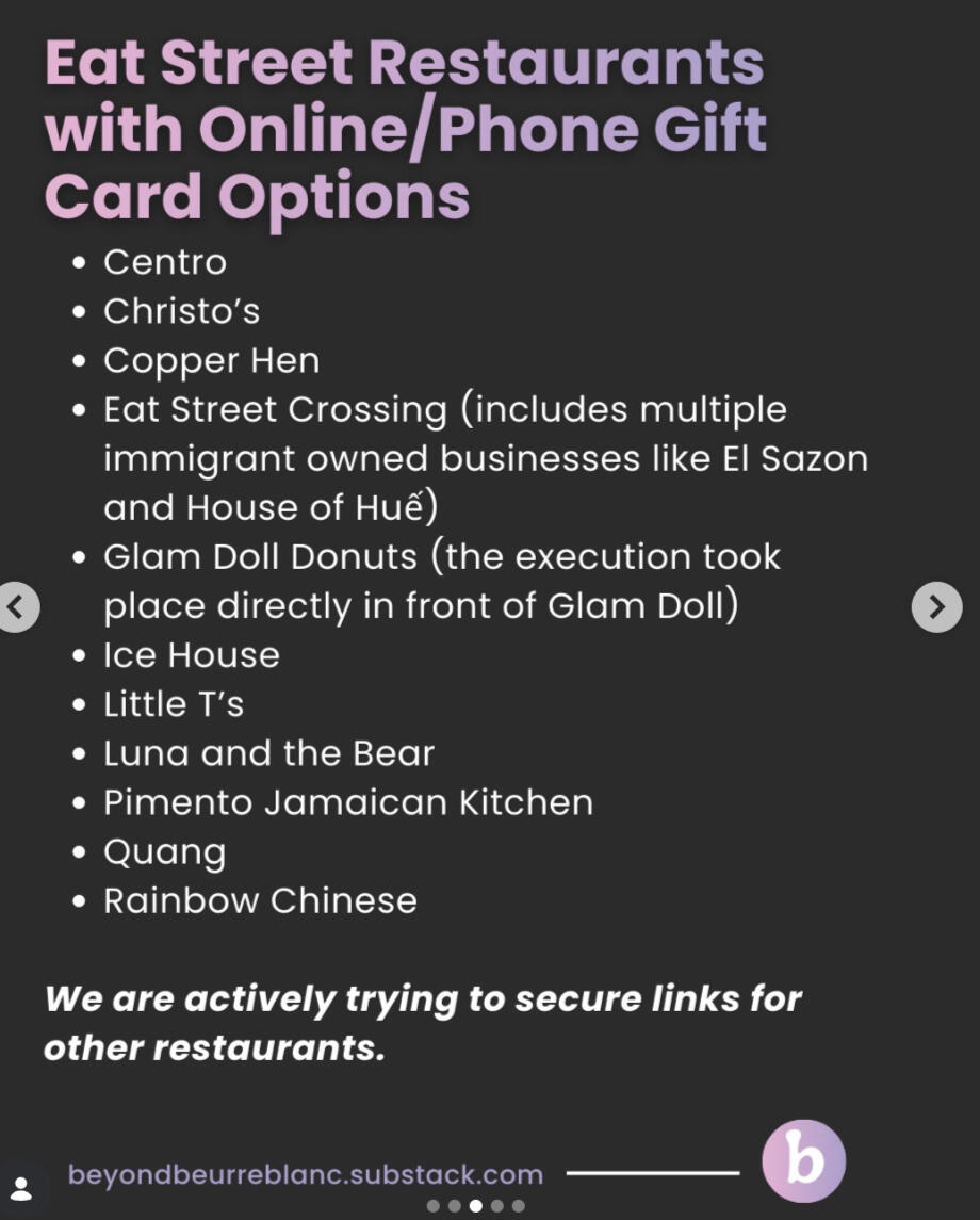 Support Eat Street Right Now - from beyondbeurreblanc substack pageBeyond Beurre Blanc has more information on their substack page, link above and they are one of the main people helping to amplify mutual aid in the Minneapolis area. I highly recommend following their substack and Instagram page.Centro