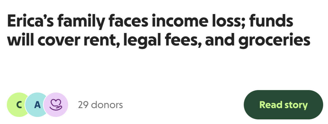 Erica is a resilient and hardworking neighbor who has become the sole provider for her family during an incredibly challenging time.After recently overcoming three months of being unhoused, Erica and her family finally found comfortable housing. However, their stability is now threatened by the increased ICE presence in Minnesota, which has upended their daily routine and made it unsafe for her husband to work.He is now at home caring for their two young children and supporting their e-learning, leaving Erica as the only source of income.This sudden change has placed a tremendous financial strain on the family. They are facing urgent needs, including legal fees and the ongoing costs of maintaining their home.With only one income, it has become increasingly difficult to afford groceries and other essentials. Despite these hardships, Erica continues to do everything she can to support her family and keep them safe.Your support can make a real difference for Erica and her loved ones. Every contribution will go directly to helping them stay housed, cover legal expenses, and provide for their basic needs during this crisis. Please consider standing in solidarity with Erica’s family—your generosity and kindness are deeply appreciated!