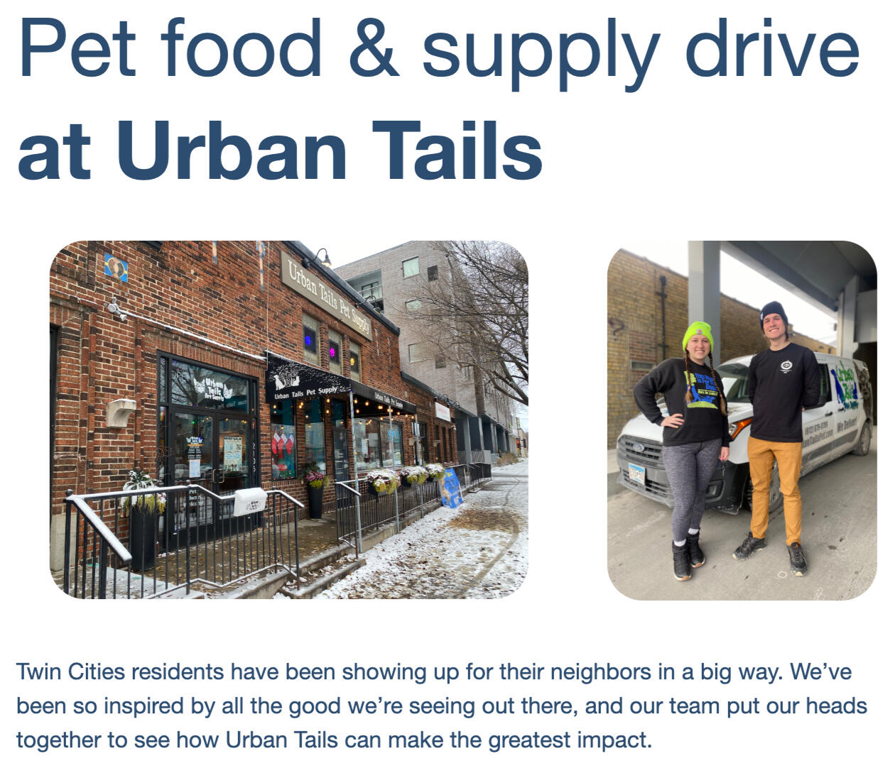 I've been watching for ways that we can help pets too. When families are struggling to pay rent, feed themselves, and can't leave the house this also means its hard to get what they need for their pets. Urban Tails in Minneapolis has already been collecting a lot of donations and we can help with more.Urban Tails Pet Food & Supply Drive
