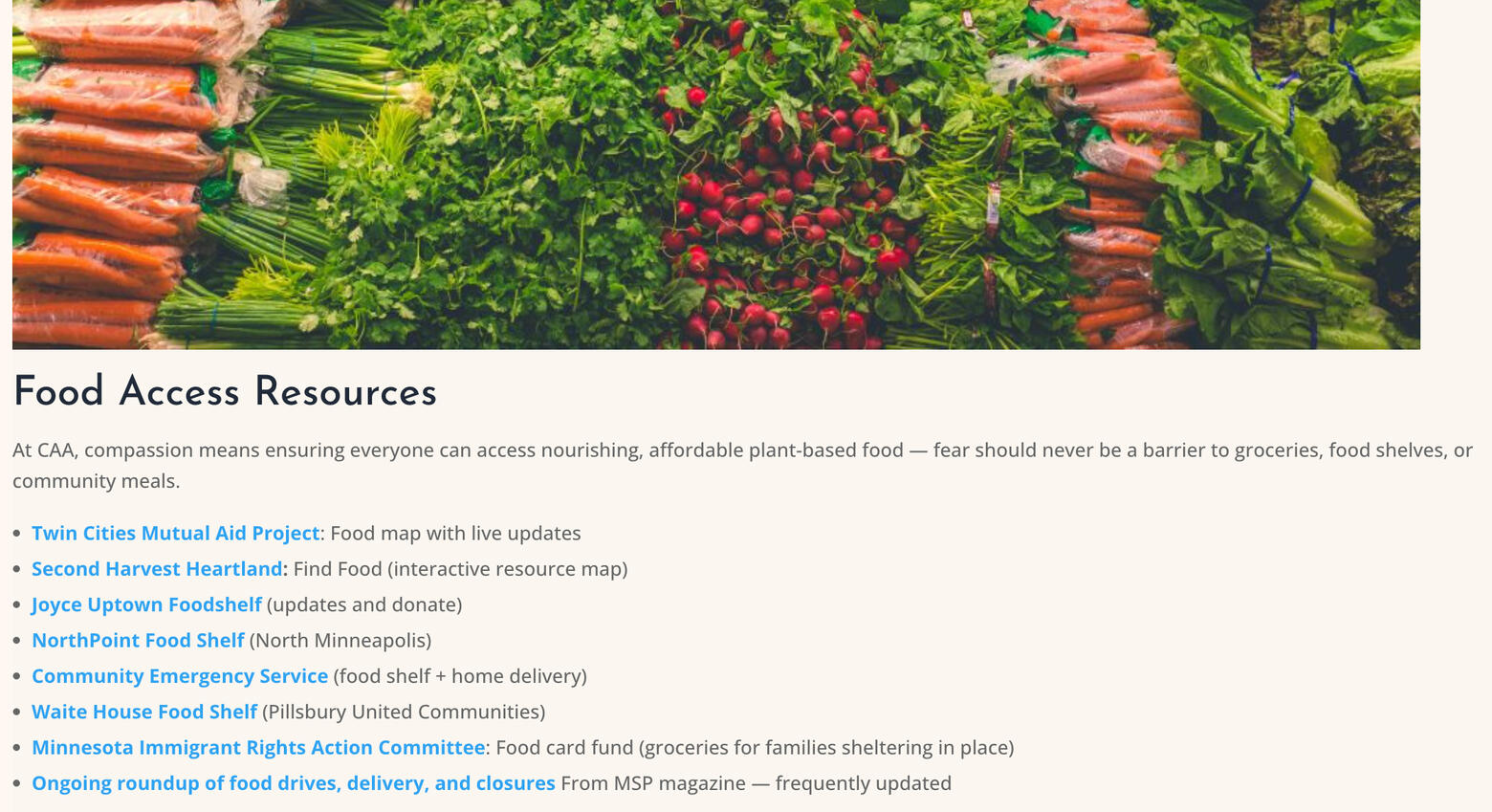 While CAA continues to host events as safe gathering spaces, we’ve heard from several volunteers, donors, and event participants who don’t feel comfortable leaving their homes.This site has many links to food access resources in Minneapolis.
