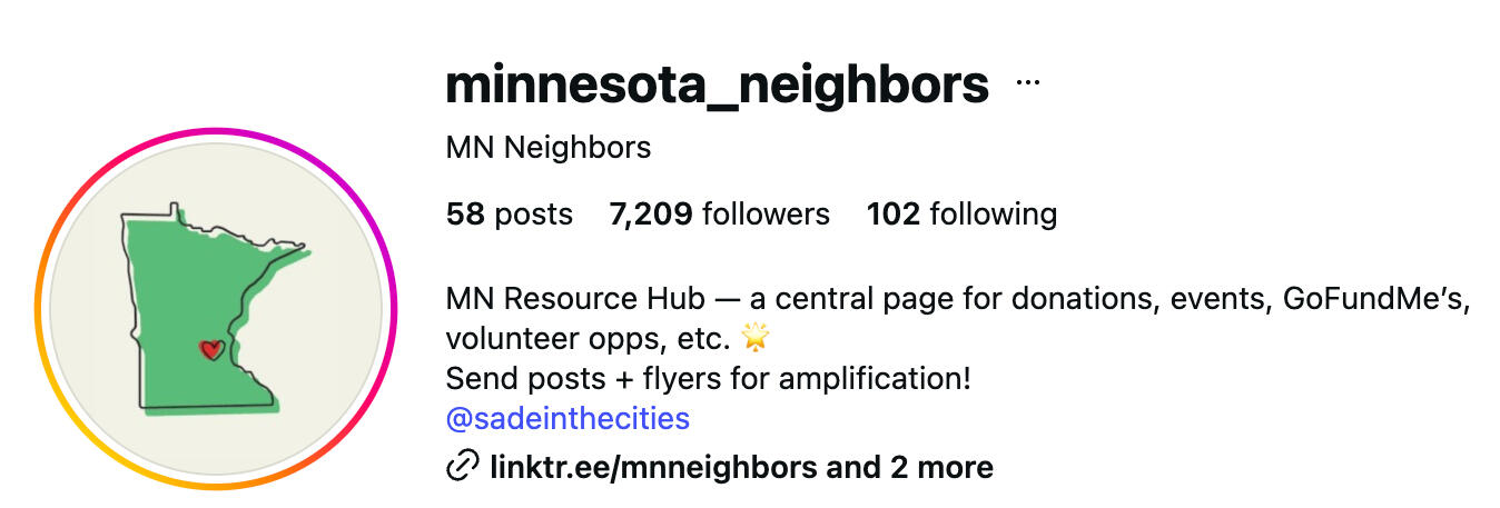 Minnesota NeighborsThis is another site that is aggregating mutual aid links and posts. Click images to go to their Instagram page or click this link to go to their website.