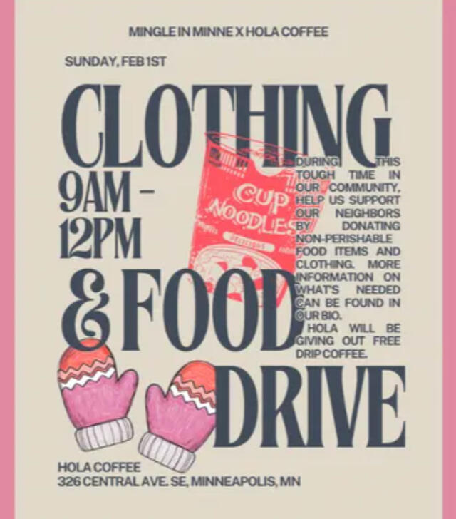 As of Feb 9 - $2000 to reach goal.Stand With Our Neighbors: Emergency Support for Families Impacted by ICE RaidsHola Coffee x Mingle in Minne Cash Donations for February Food and Clothing Drive.Right now, many of our neighbors in Minneapolis are living with fear and uncertainty due to ongoing ICE raids affecting immigrant families across our city. Parents are afraid to go to work. Kids are missing school. Families are being separated with little warning and almost no resources to fall back on.On February 1st, we’re hosting a food and clothing donation drive at Hola to provide immediate essentials: warm clothes, groceries, and daily necessities. But so many people have asked how they can help financially, too. So we’ve created this fund to meet the urgent needs that donations alone can’t cover.
